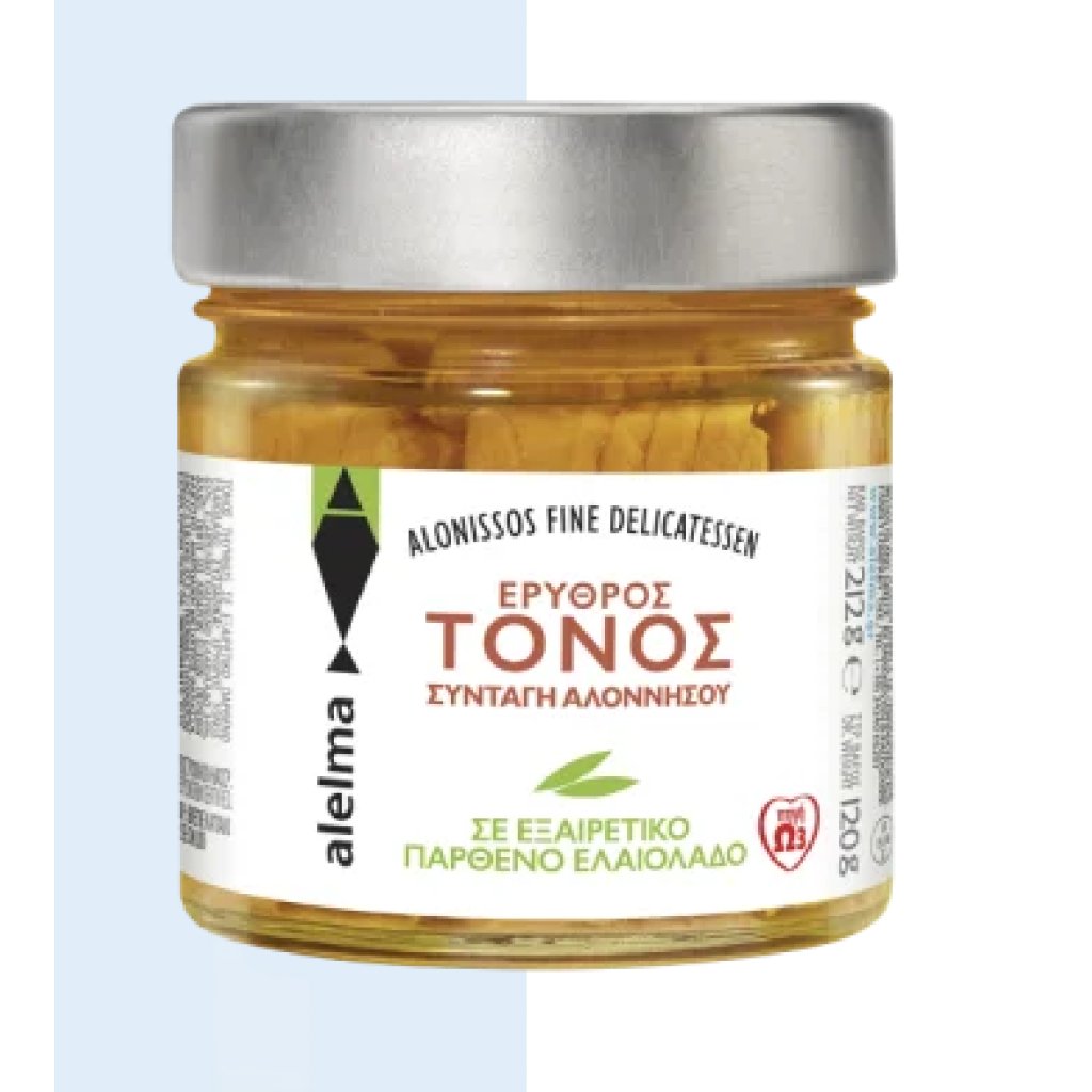 Alelma vybírá a zpracovává ty nejlepší červené tóny masa s odborností a dlouholetou zkušeností. Jemné filety z tuňáka Alelma z ostrova Alonissos. Vychutnejte si ho s vynikajícím panenským olivovým olejem a zakomponujte do nesčetných receptů.