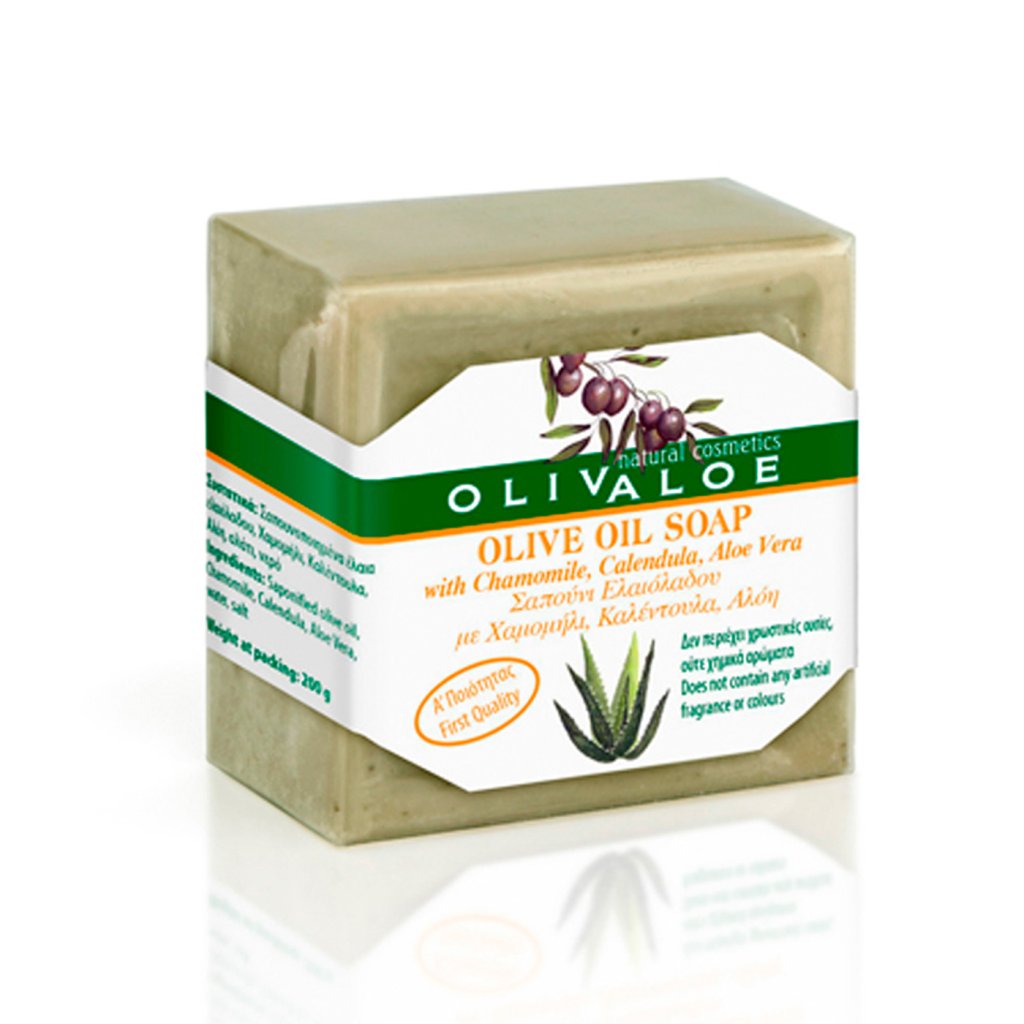 Mýdlo z olivového oleje s aloe vera, heřmánkem a měsíčkem – vysoká kvalita. Neobsahuje žádné umělé parfemace ani barviva.