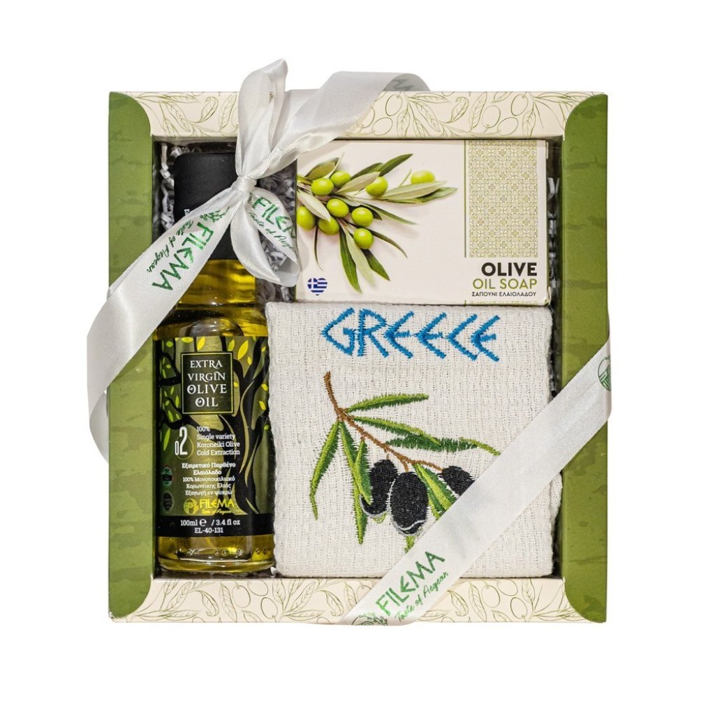 Dárková sada 102 s olivovým olejem 100ml, olivovým mýdlem a tkaninou ze skelných vláken.